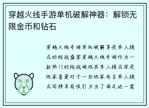 穿越火线手游单机破解:享受单人模式的枪战盛宴 穿越火线手游作为一款热门的枪战游戏,其多人模式深受玩家喜爱。对于一些玩家而言,单人模式同样具有吸引力。为了满足这一需求,市面上出现了穿越火线手游单机破解版...
