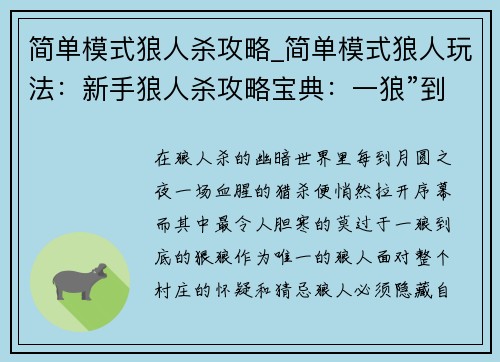 在狼人杀的幽暗世界里,每到月圆之夜,一场血腥的猎杀便悄然拉开序幕。而其中,最令人胆寒的,莫过于“一狼”到底的狠狼! 作为唯一的狼人,面对整个村庄的怀疑和猜忌,狼人必须隐藏自己的身份,在白天游刃有余地游...